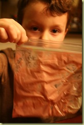 Let the children choose which 2 colors they would like to add to a baggie. Noah chose blue and yellow. Elijah chose red and blue. Then let them squish away (make sure the baggie is completely closed)!!!!! This is so much fun for the kiddos, such a cool feeling getting to mush it all together. Great learning project for primary/secondary color teaching.